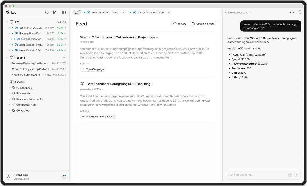Leo creates campaigns, reports, and creatives in seconds, taking care of the tedium while you can focus on other tasks.