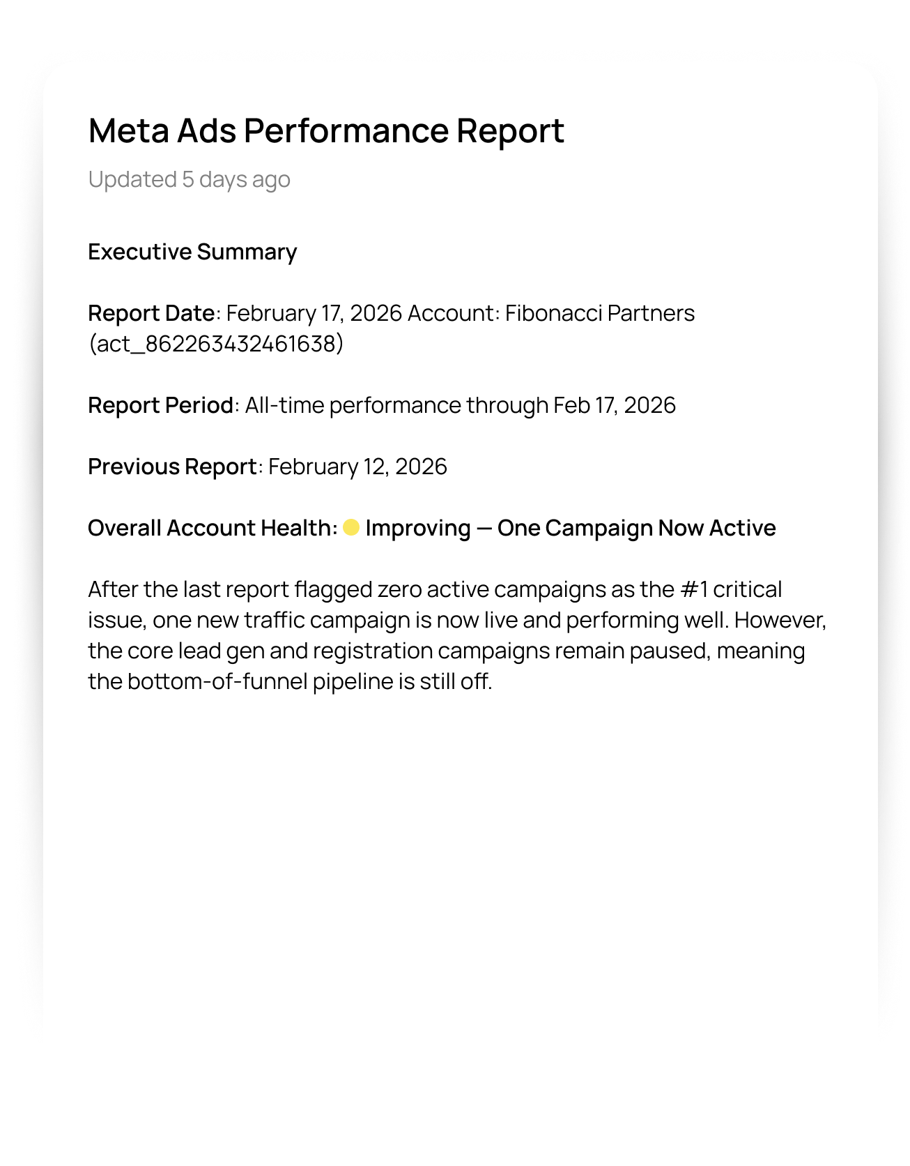 Once you create your account, Leo connects to your ad platforms, analyzes your competitors, and delivers a full audit with clear opportunities and a strategy for growth.