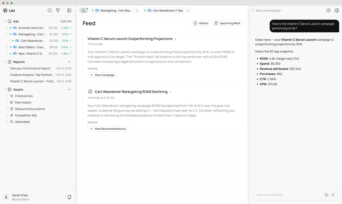 Leo creates campaigns, reports, and creatives in seconds, taking care of the tedium while you can focus on other tasks.